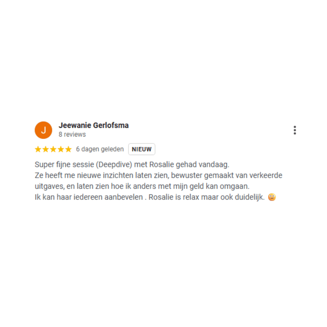 In dit traject van 6 maanden begeleidt Rosalie je persoonlijk naar echt overzicht. Niet met een droge spreadsheet, maar door samen te kijken hoe jouw geld stroomt, wat je tegenhoudt en wat er concreet anders kan.